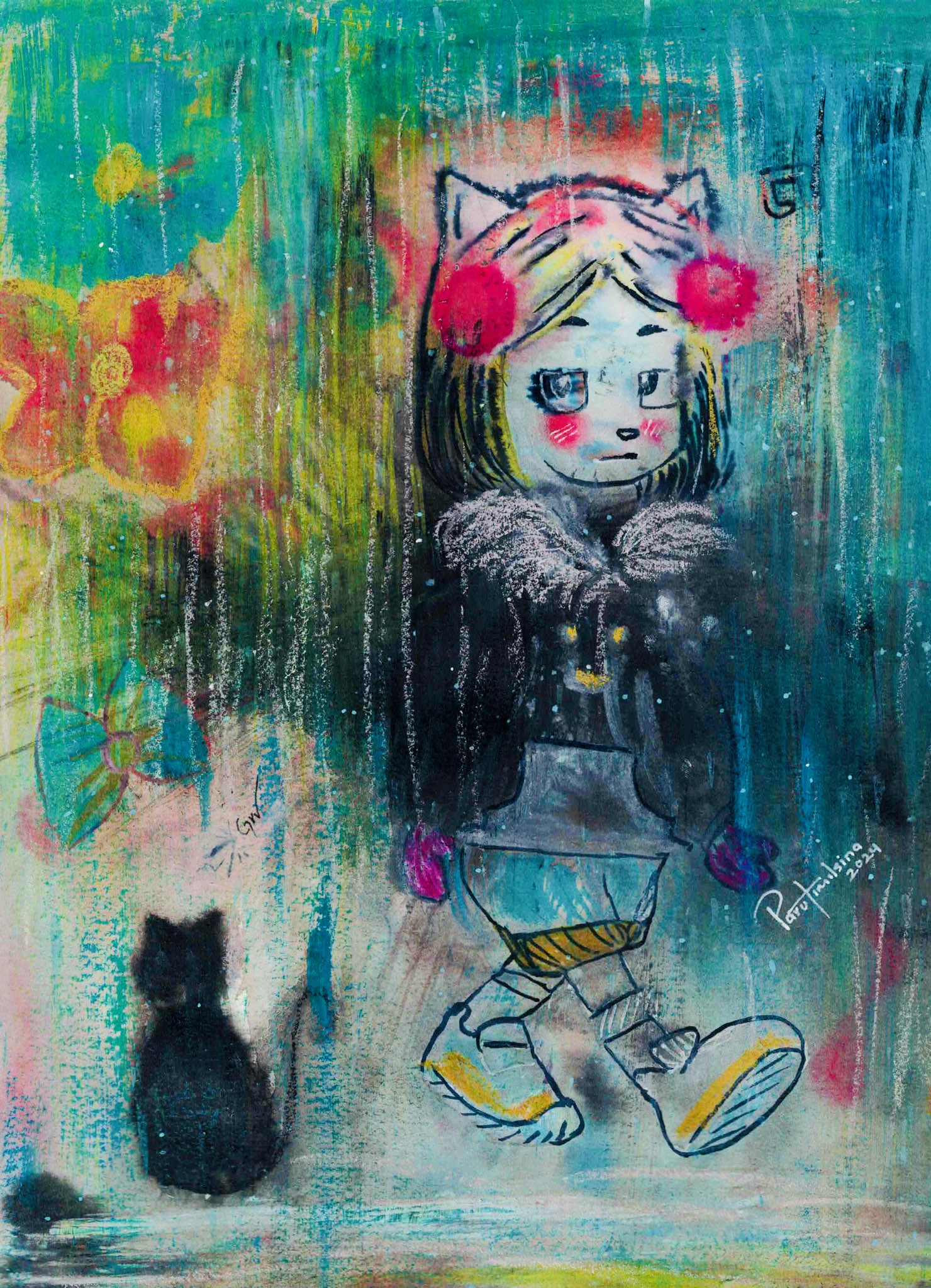 The rain pouring soaking sheets angered kitty who, bored and furious growled at no one in particular. Flowers bloomed soaked in rainy sunshine exploding in bright virgin colors near Glegle. Trucking along thru it all Glegle was curious, what was all the fuss about? She was sure of her coself…happy to share…the rest…was just noise.